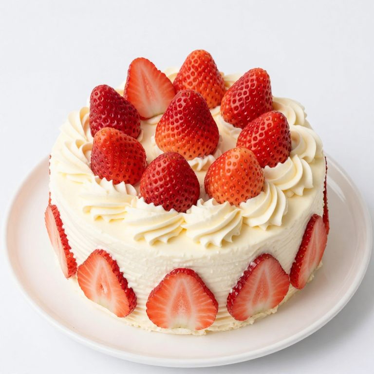 Delicate strawberry and vanilla cake topped with vibrant whole strawberries and halved slices, artfully arranged in a circular pattern atop creamy swirls of frosting, presented on a pristine white plate.