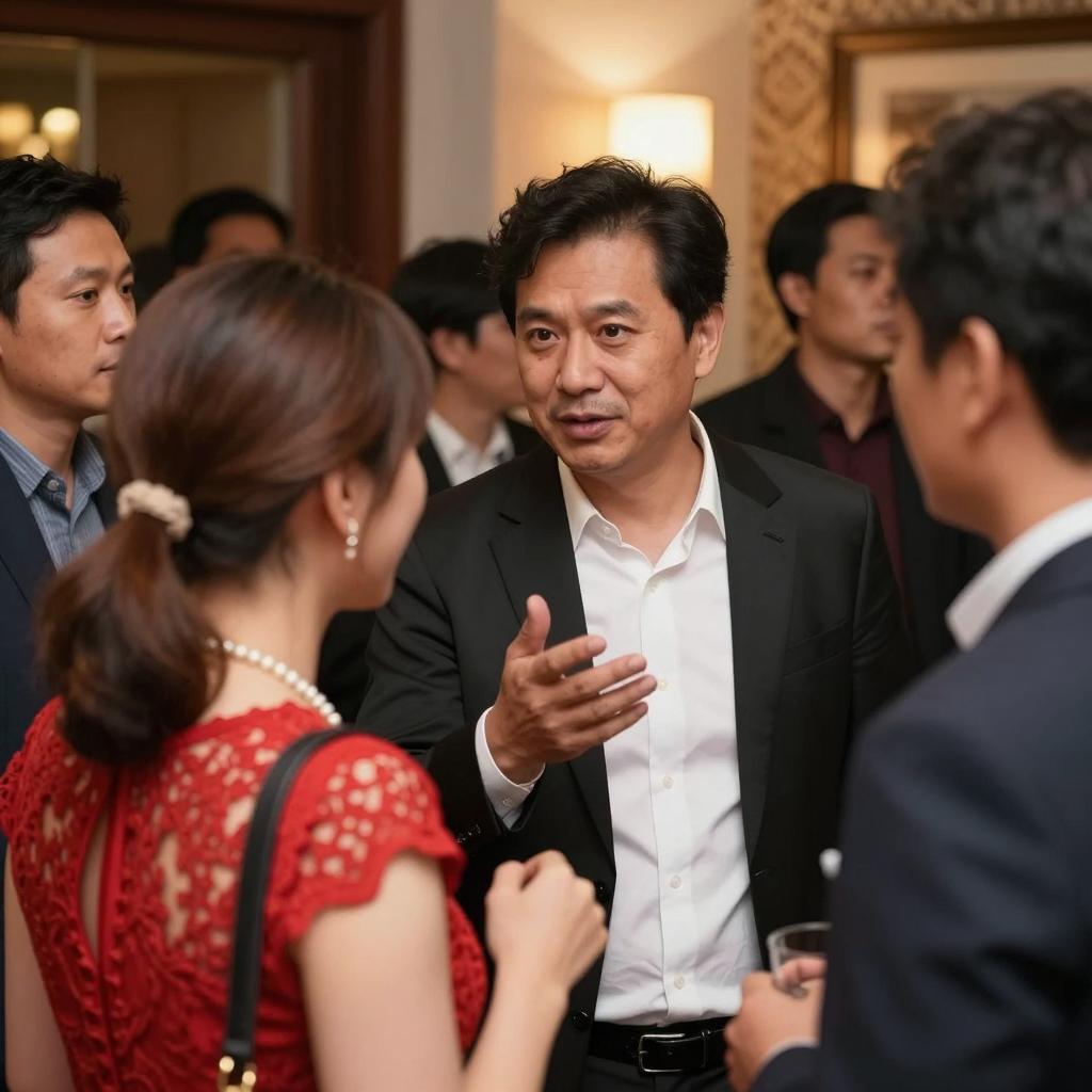 A crowded indoor social event. A man with dark hair, wearing a dark gray suit and white shirt, stands to the right, gesturing with his right hand. A young girl with long dark hair, wearing a floral dress with ruffled sleeves, faces him. Multiple people in the background, some with backs turned, some partially visible. Bright natural light from windows.