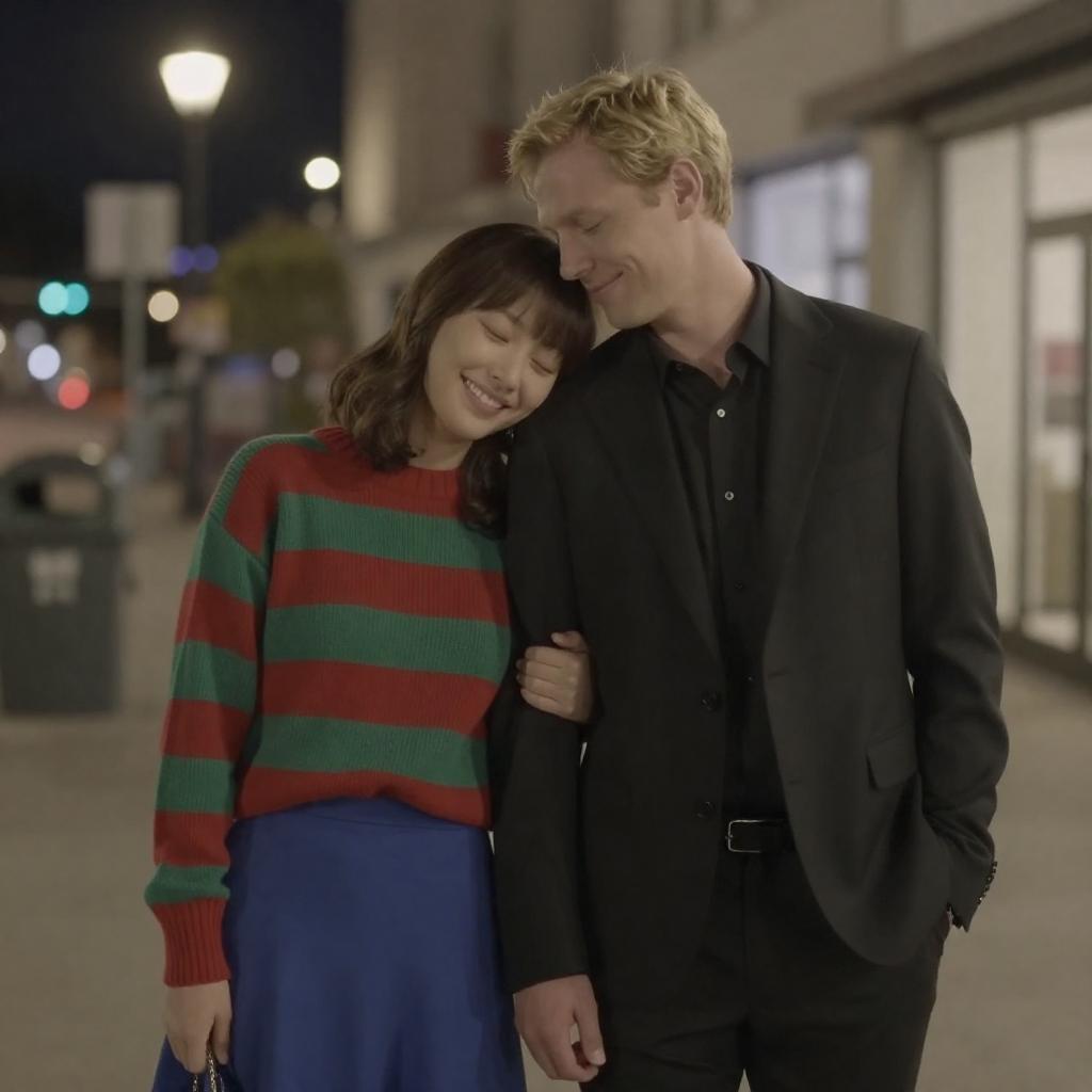 Photograph of a couple on a dimly lit street at night. Woman with shoulder-length brown hair, red and green striped sweater, and blue skirt, smiling, leaning into a man with short blond hair, black suit, and black shirt, smiling back. Both eyes closed, heads gently touching. Background includes blurred street lights, trash bins, and storefronts.