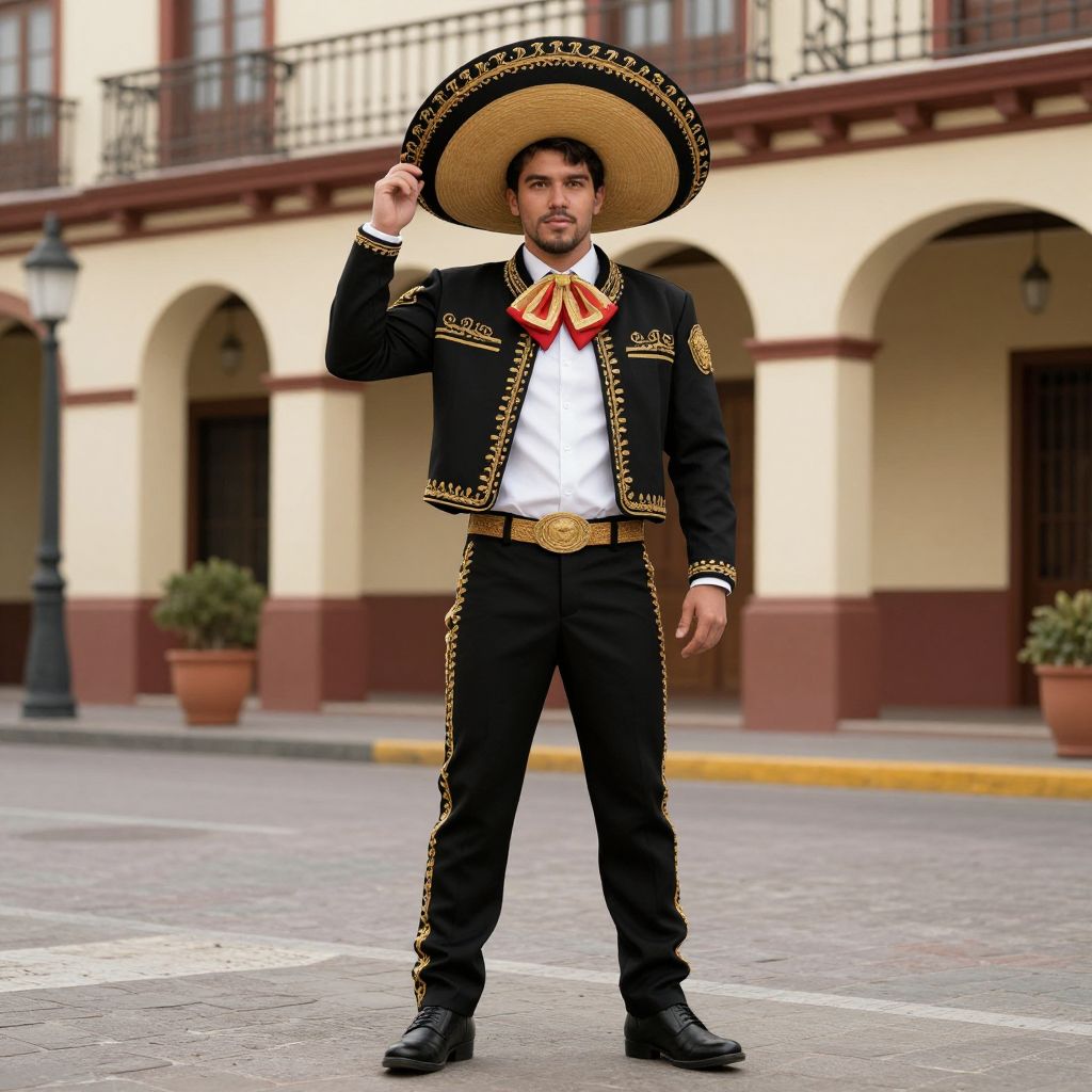 Spanish Fancy Dress Costume, dressed in a mexican costume standing in front of a building