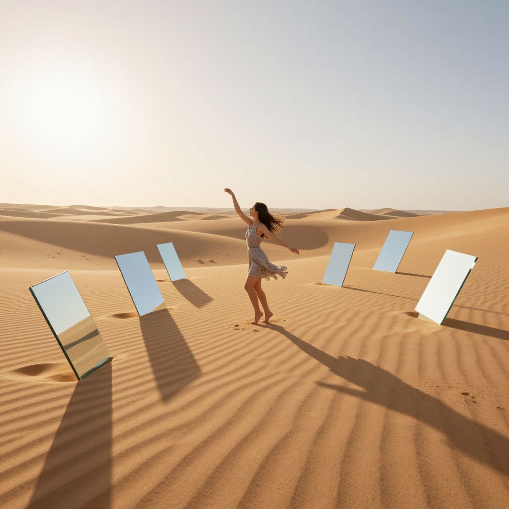 A surreal 3D-rendered scene set in a vast desert under golden-hour lighting, where a woman stands amidst floating glass mirrors, her shadow cast independently as if dancing in its own world, creating a dreamlike and ethereal visual effect.