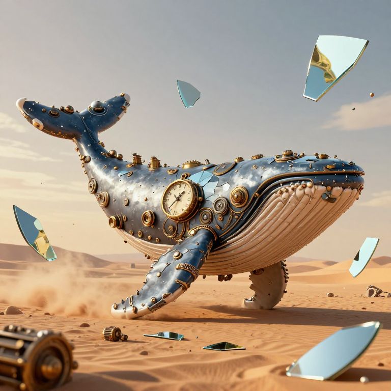 A towering steampunk-inspired clockwork whale, rendered in high-definition 3D art, lumbers across a desolate desert landscape scattered with shattered mirrors, each fragmented surface reflecting alternate fates of the world under dramatic golden-hour lighting.