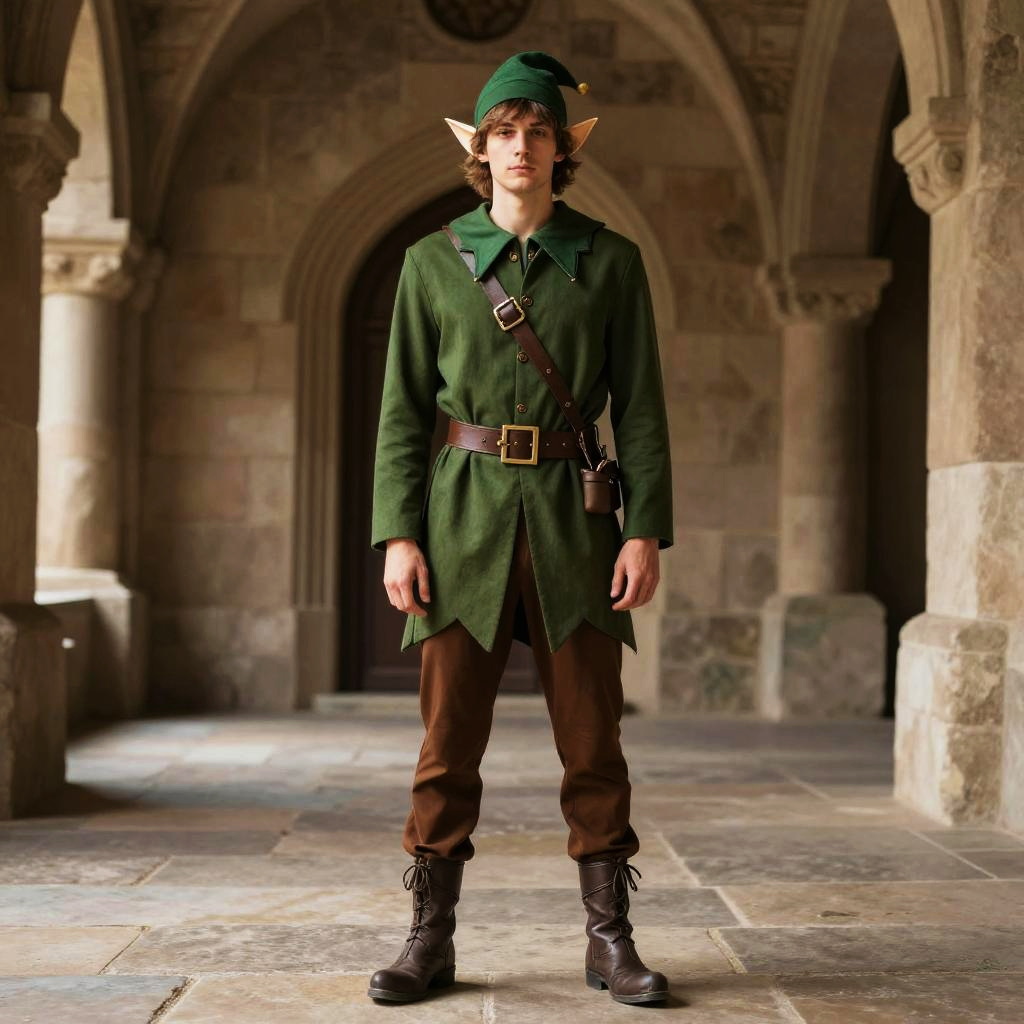 Male Elf Outfit, male elf in green and brown outfit standing in a hall