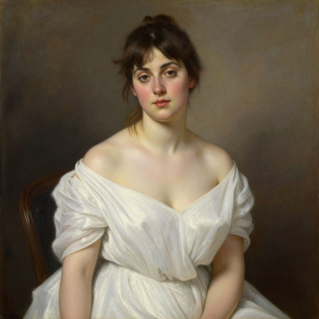Classical painting of a young woman with fair skin, dark brown hair in a loose bun, wearing an off-shoulder white dress, seated against