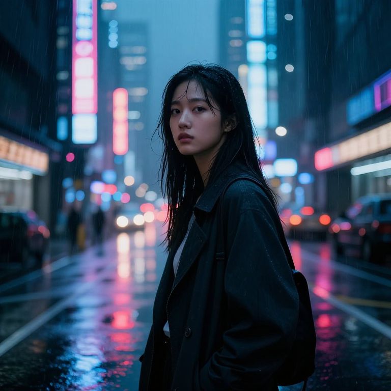 Portrait of a young East Asian woman standing in a rainy futuristic city street at night. Neon lights reflect off the wet pavement, creating vibrant color contrasts in a cyberpunk aesthetic. She wears a dark oversized coat with a high collar, has wet black hair, and carries a backpack. The moody atmosphere is enhanced by dynamic lighting and blurred cityscape background with glowing neon signs and traffic lights.