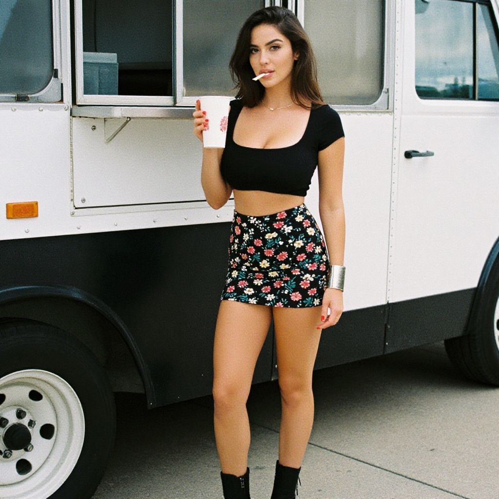 A woman, kodacolor analog film style, contemporary street style, black crop top, high-waisted floral mini skirt, black ankle boots, silver bangle, standing by a food truck, ordering a meal. Sexy. Pretty face and beаutiful eyes. Big breasts