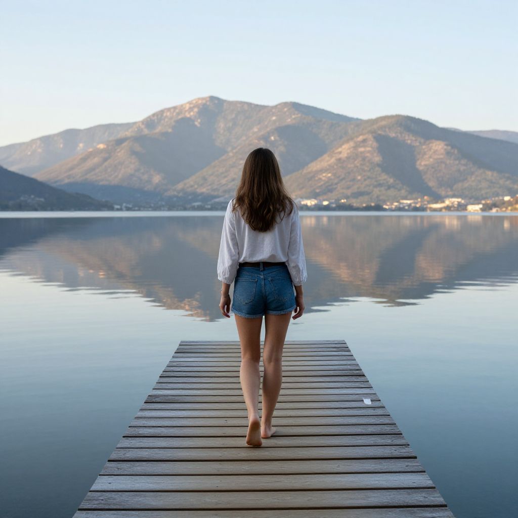 A close-up photograph of a serene river at dawn, showing smooth flowing water cascading over smooth stones, with soft golden light filtering through the trees in the background. A young woman with brown hair and gentle eyes stands near the bank, standing barefoot in the shallow water, looking calmly into the current.