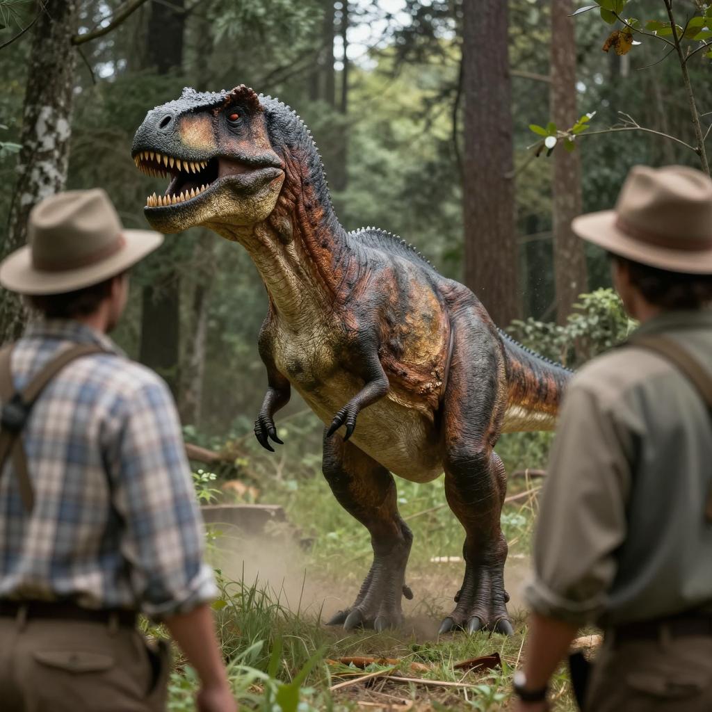 Photograph of a woman with red hair and a red long-sleeve shirt, standing on a forest path. A large, close-up dinosaur head with sharp teeth and ured skin is on the left. She looks up at the dinosaur. Dense green foliage and fallen leaves fill the background. The woman is in profile, facing right. The dinosaur is in the foreground, slightly to the left. Two people.