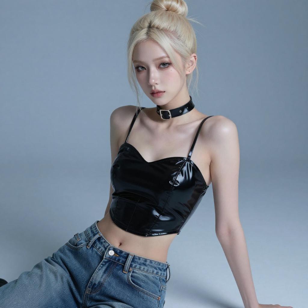 Photograph of a young woman with light blonde hair in a ponytail, wearing a white and blue "Looney Tunes" crop top with red circular , and white shorts. She has fair skin, red lipstick, and blue eye makeup, standing against a white wall with blue lighting.
