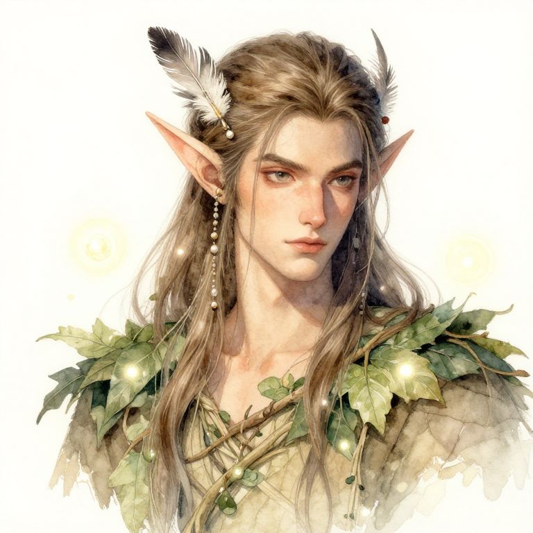 Male elf art portrait with serene expression, long flowing hair with feathers and beads, wearing natural earth-toned clothes woven from leaves and vines, surrounded by magical glowing orbs, painted in delicate watercolor style with fine details and soft shadows.