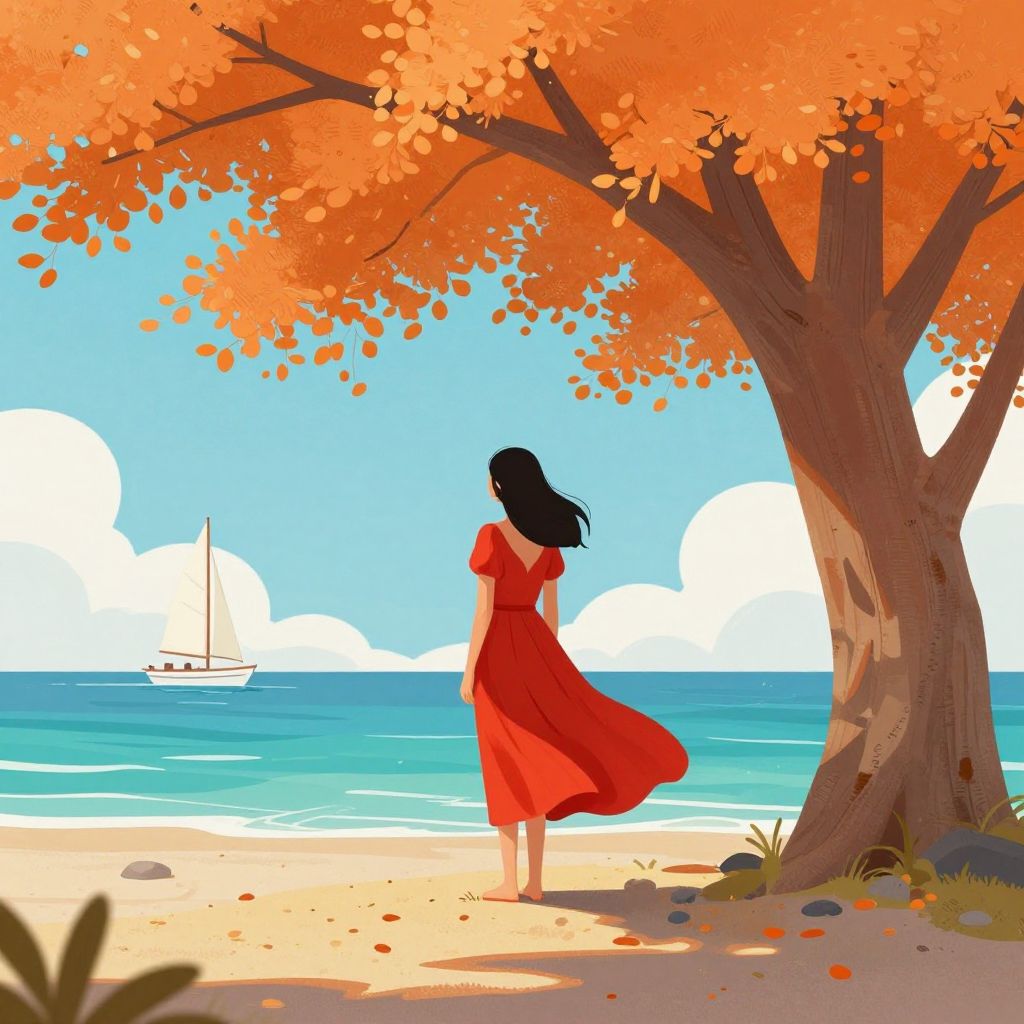 Digital illustration of a woman with long black hair, wearing a flowing red dress, standing on a sandy beach under an orange autumn tree. She faces the turquoise ocean with a white sailboat in the distance. The sky is bright blue with fluffy white clouds. The tree's branches and leaves dominate the upper right, casting a warm orange hue. The sand is scattered with small rocks and fallen leaves. The artwork has a vibrant, whimsical style with bold colors and clean lines.