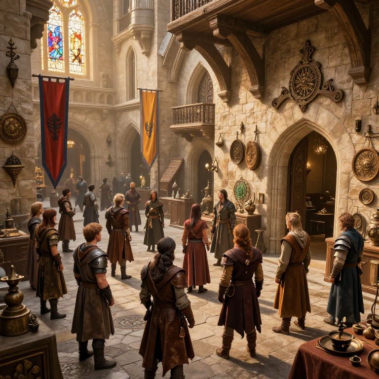 Adventurers guild nestled at the edge of a sprawling fantasy city, bustling with diverse characters in worn leather armor, vibrant banners fluttering, ancient wooden beams and mystical artifacts decorating the stone walls, warm golden sunlight filtering through stained glass.
