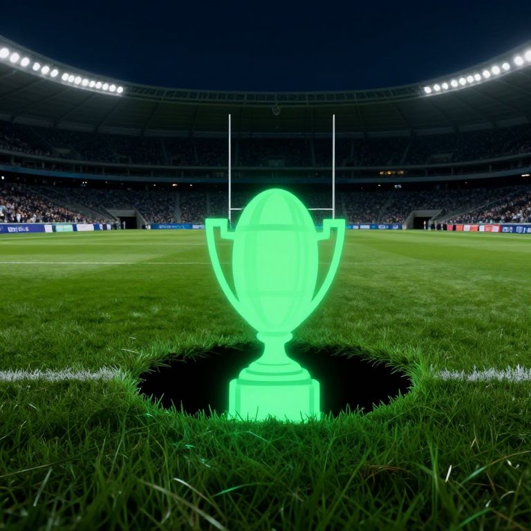 Glow-In-The-Dark Sticker A rugby pitch with a large hole in the pitch. out of the hole a trophy appear. the stadium is at night,