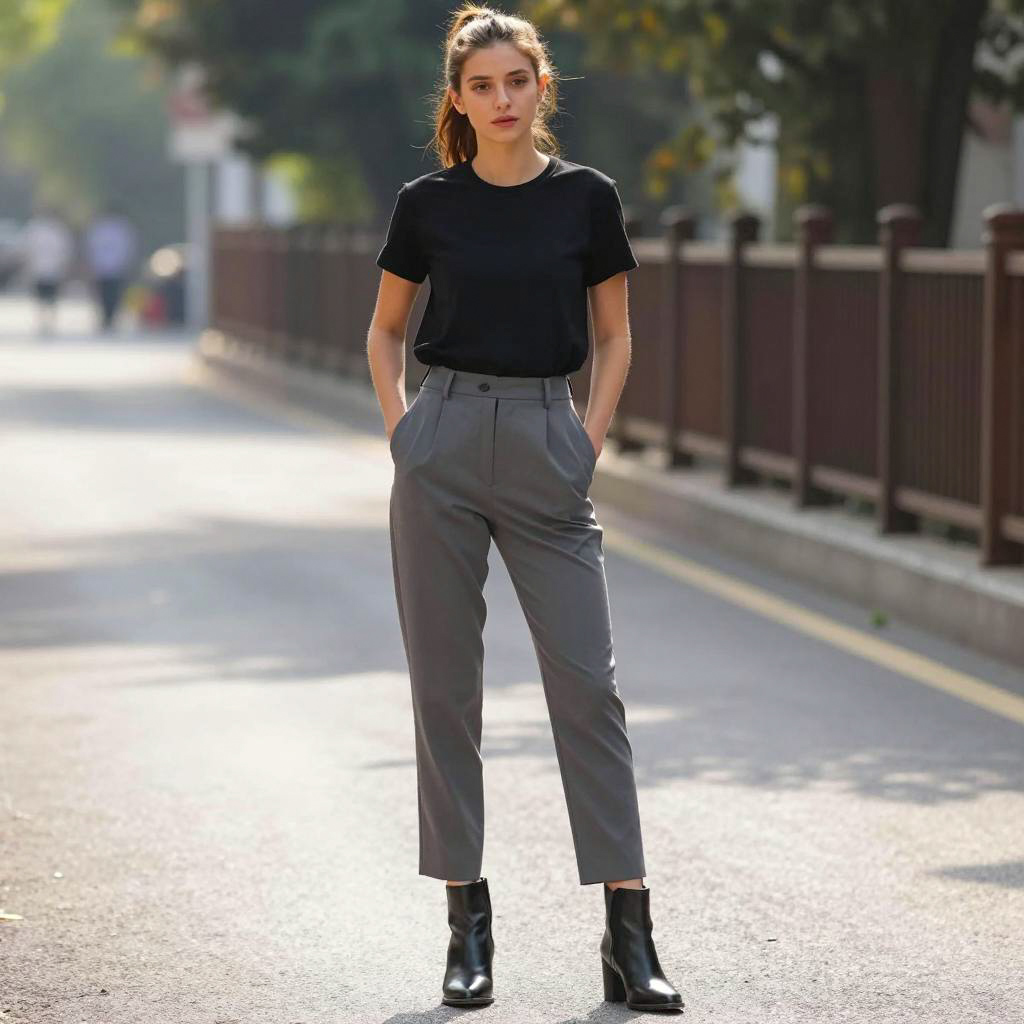 Pants style woman costume, photograph of a young woman standing on a sunlit pathway, wearing a black t-shirt and gray high-waisted pants, black high-heeled ankle boots, hands in pockets, brown hair in a ponytail, subtle makeup, casual street style, blurred background with trees and a wooden fence, daytime, natural light, urban park setting, realistic, fashion photography, full body shot, slight shadow on the ground, relaxed pose