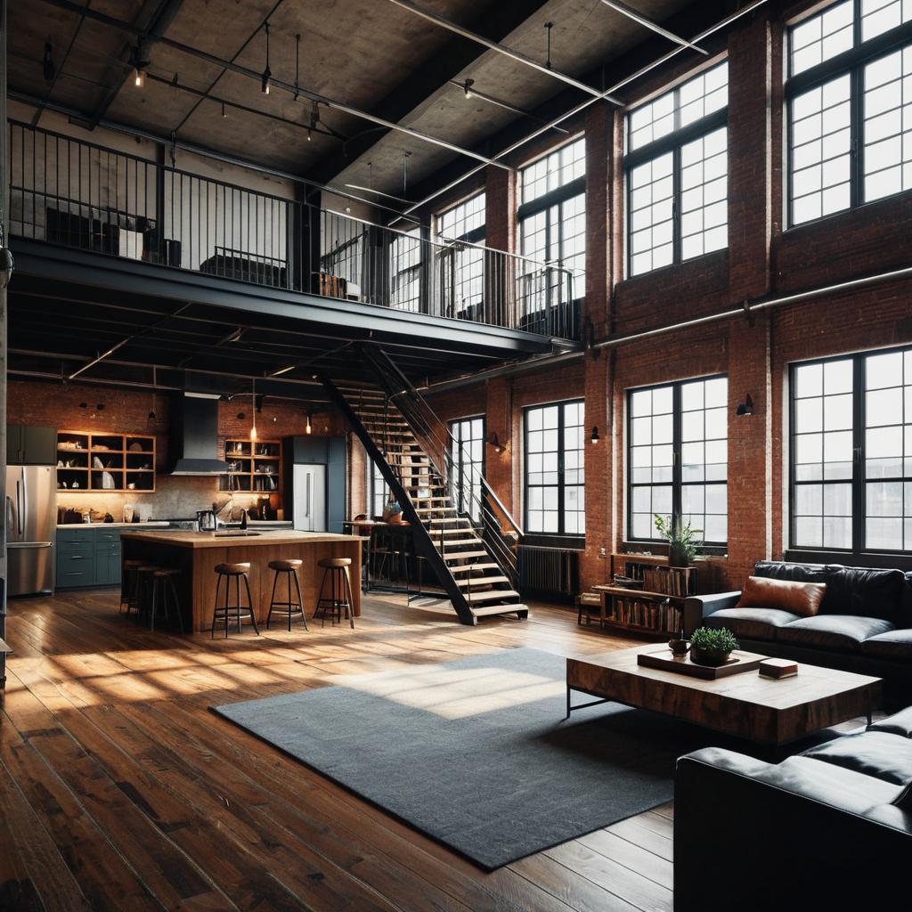 Spacious industrial loft apartment featuring large black-framed windows, exposed brick walls, and high ceilings. The open floor plan includes a modern kitchen with wooden cabinetry, stainless steel appliances, and a central island with bar stools. The living area has dark leather sofas and a wooden coffee table on a gray area rug. A metal staircase leads to a mezzanine level with additional seating and railing. Warm ambient lighting enhances the cozy, modern industrial aesthetic.