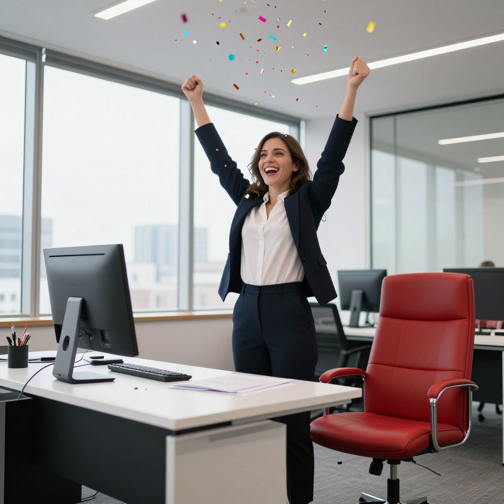 A businesswoman celebrates success in her office, surrounded by confetti.