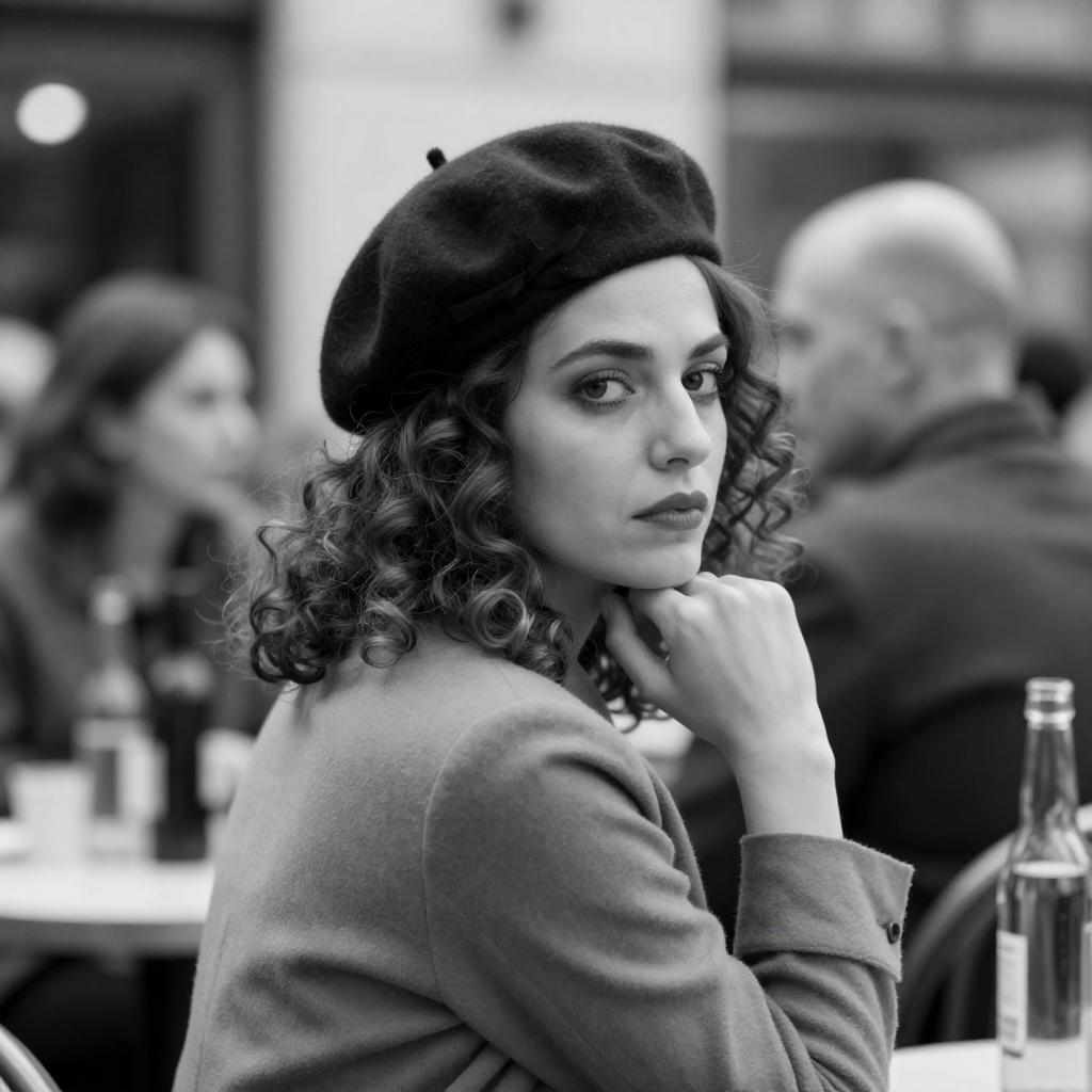 Black-and-white photograph of a woman with short, curly hair and a low-cut, white blouse with puffed sleeves, holding a tray with a glass and a pitcher. She wears a black choker and corset. A man with a stern expression peers from a window in the background. She stands in a dimly lit room with ured walls and a curtain.