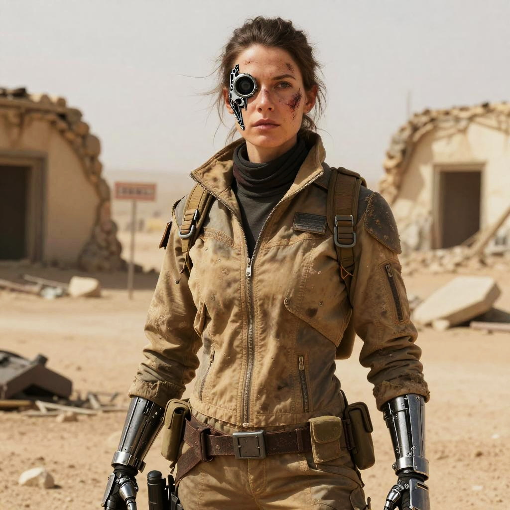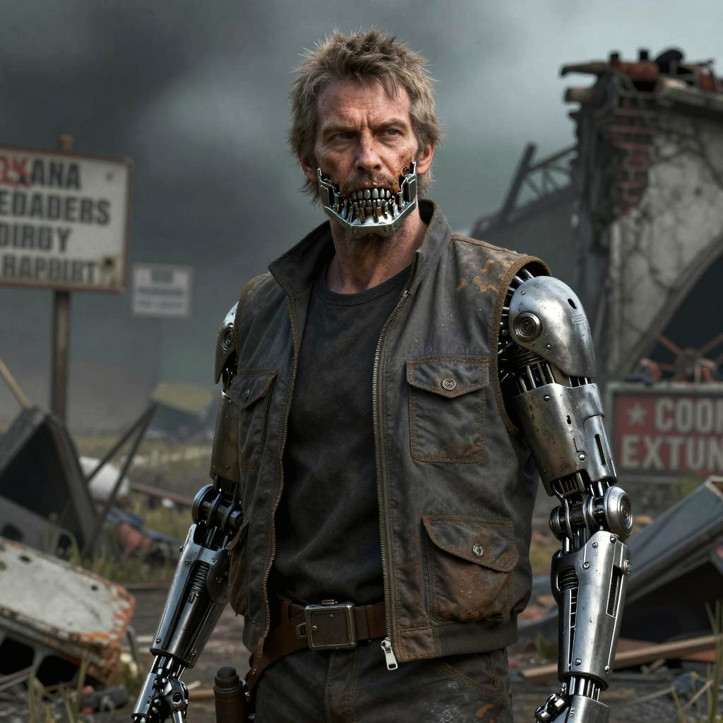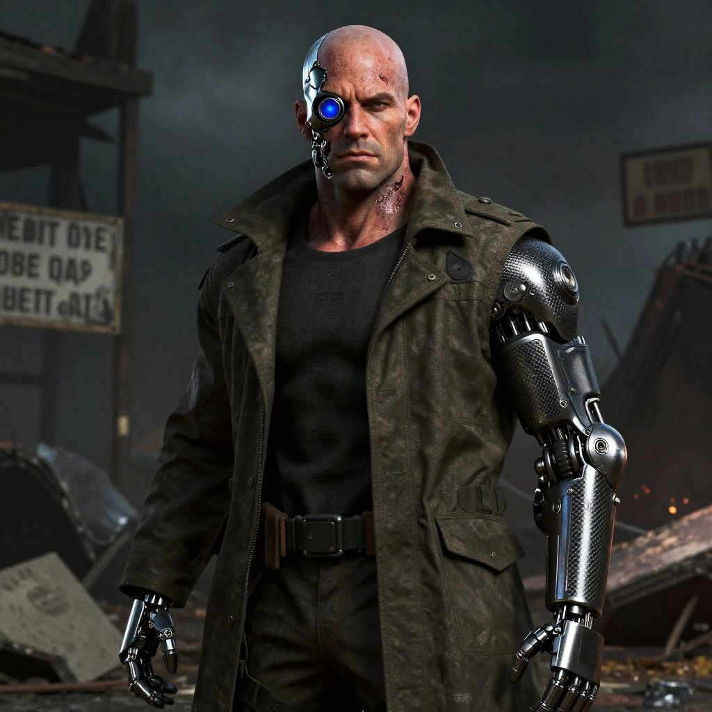 Exposure Bracketing sci-fi grimdark setting, grizzled old male engineer with metal jaw replaces burnt mandible and full robotic left arm, wearing a oil-stained gray work vest, standing with a stoic expression with ruins and signs of warfare behind him