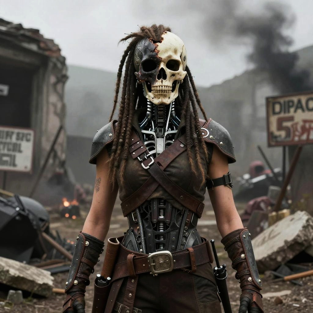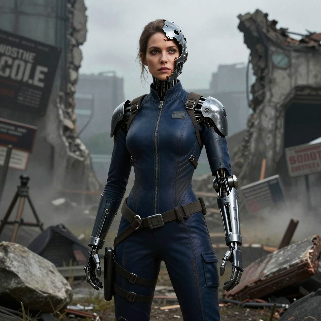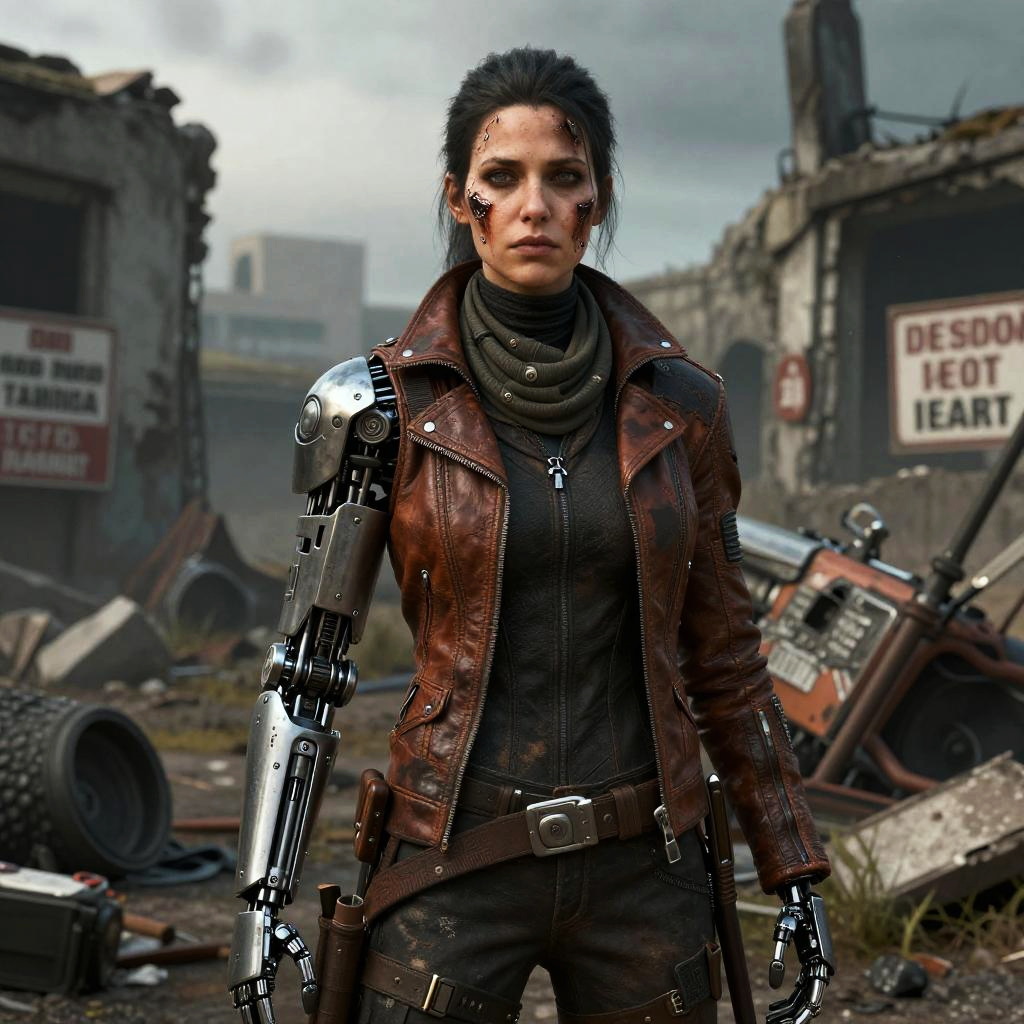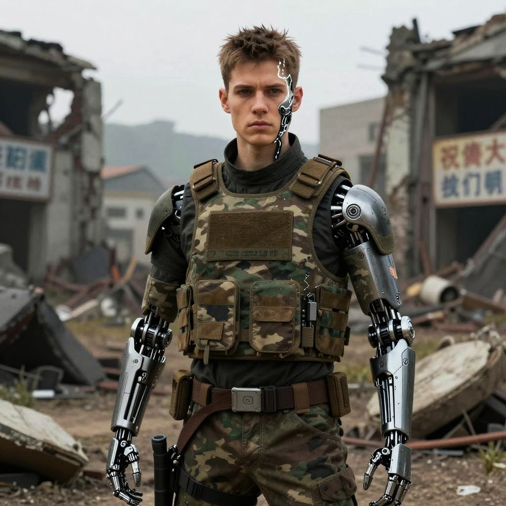 Exposure Bracketing sci-fi grimdark setting, grizzled old male engineer with metal jaw replaces burnt mandible and full robotic left arm, wearing a oil-stained gray work vest, standing with a stoic expression with ruins and signs of warfare behind him