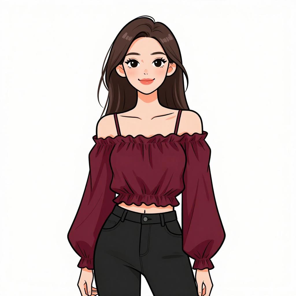Digital anime-style drawing of a young woman with long, straight dark brown hair and fair skin. She has large, expressive brown eyes and a small, friendly smile. She wears an off-the-shoulder, burgundy, ruffled crop top with black spaghetti straps and high-waisted black jeans. The top's sleeves are long and slightly puffed. The background is plain white, emphasizing the character. Her relaxed, confident posture and casual attire suggest a laid-back, modern look. The drawing uses bold, clean lines and vibrant colors typical of anime art.
