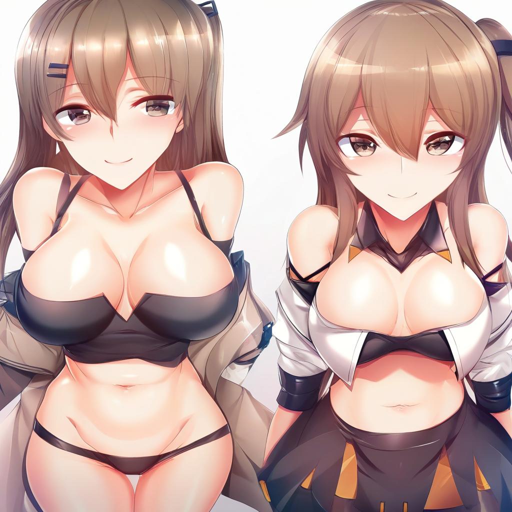 K2 (girls' frontline), girls' frontline, 1girl, brown eyes, hair between eyes, brown hair, long hair, sidelocks, hairclip, medium breasts, large breasts, cleavage, navel, collarbone, black panties, bare shoulders, one side up, by artist silly (marinkomoe), leet