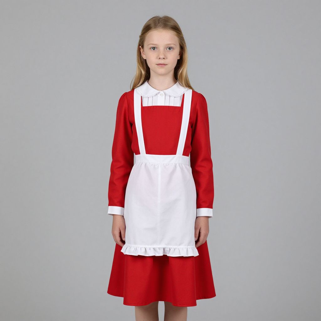 Little orphan annie costume, solo, 1girl, apron, realistic, dress, looking at viewer, long sleeves, blonde hair, arms at sides, closed mouth, red dress