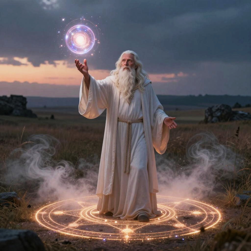 Mage stable diffusion, an elder mage spreading stable diffusion magic in an open field at twilight with floating orbs of light, luminous magical fog diffusing around, magical circle inscribed on the ground, beautifully detailed mystical fantasy scene.