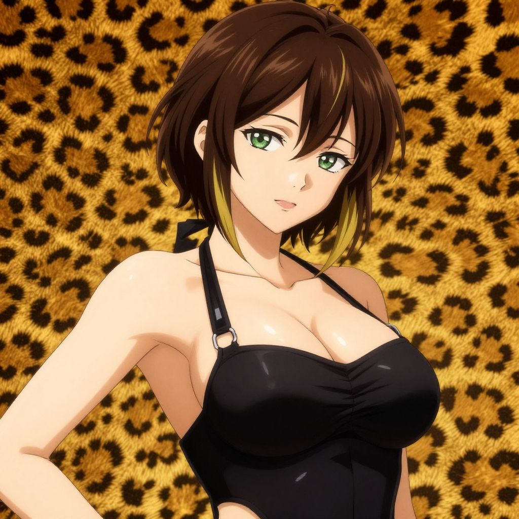 A digitally illustrated anime-style woman with green eyes and short, layered brown hair with blonde highlights poses confidently against a vibrant leopard print background. She wears a black halter top that emphasizes her figure, with detailed shading and highlights that showcase the polished, semi-realistic anime art style.