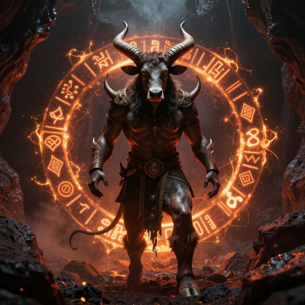 A figure portraying Veles, the Slavic god of the underworld, cattle, and magic, depicted with a bull's head, long hair, and dressed in medieval-style dark robes with golden embellishments. He holds a trident-like staff and wears symbolic jewelry, standing in a misty forest glen surrounded by ancient standing stones inscribed with mystic runes. The scene conveys a mystical and ancient atmosphere, evoking themes of wisdom, magic, and the guidance of lost souls.