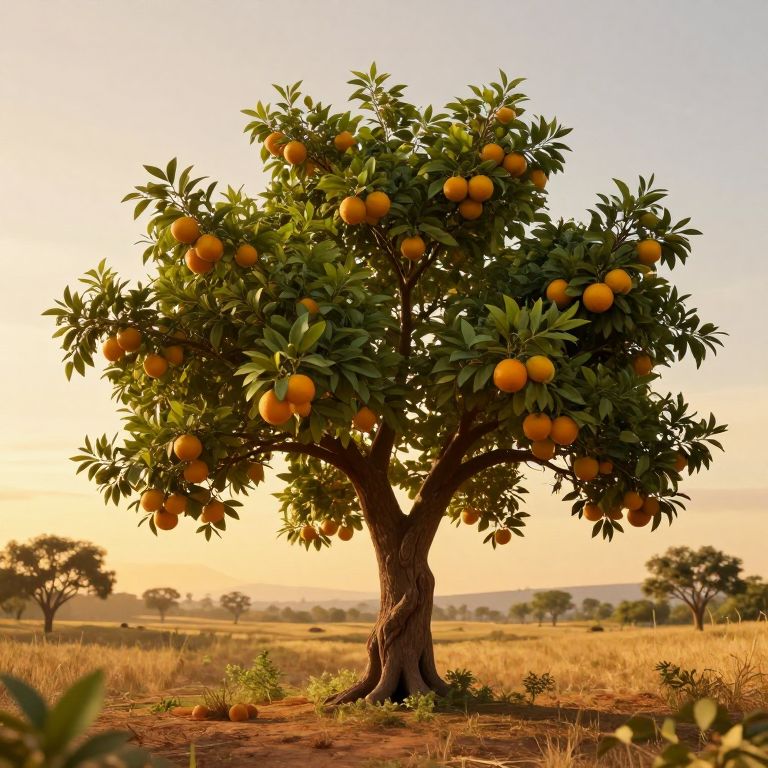 A digitally rendered, high-definition scene depicts a solitary orange tree with a gnarled trunk and sprawling branches adorned with vibrant yellow fruits, set against a serene, golden-hour landscape with a distant horizon and scattered trees, evoking a nostalgic and timeless atmosphere.