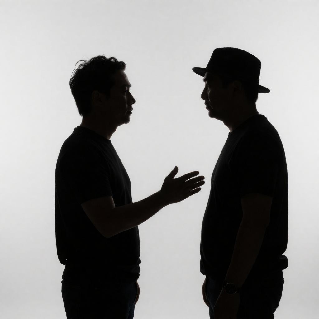 Silhouetted photograph of two men facing each other against a bright white background. The man on the left, with short, dark hair, extends his hand towards the man on the right, who wears a hat. Both figures are in dark, shadowy tones, creating a stark contrast with the illuminated background.