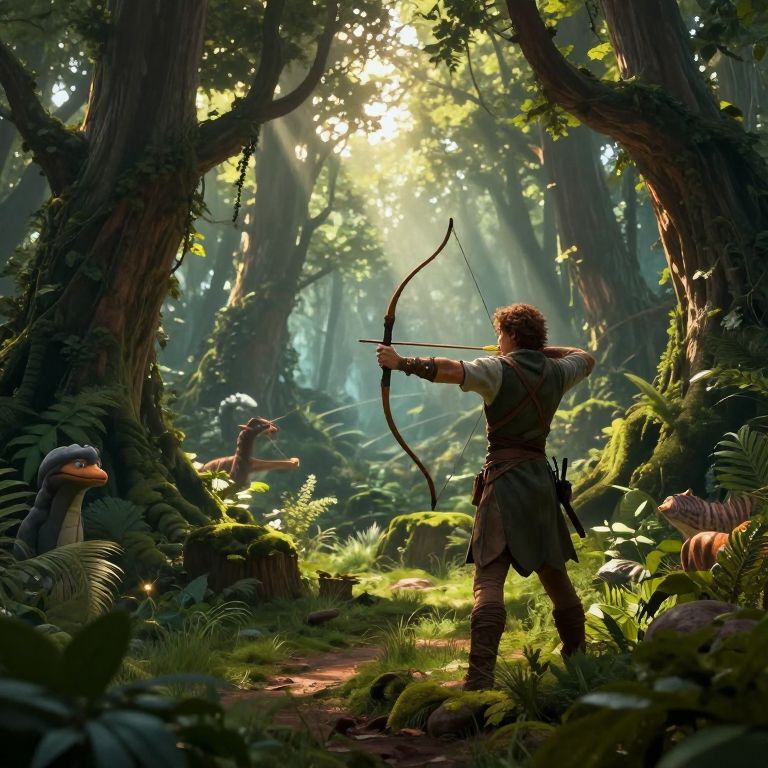 Davalos, an enchanted forest inhabited by mythical creatures, a heroic archer named Davalos aiming his bow at a distant target, beams of sunlight filtering through thick foliage, rich greens and warm tones, fantasy realism