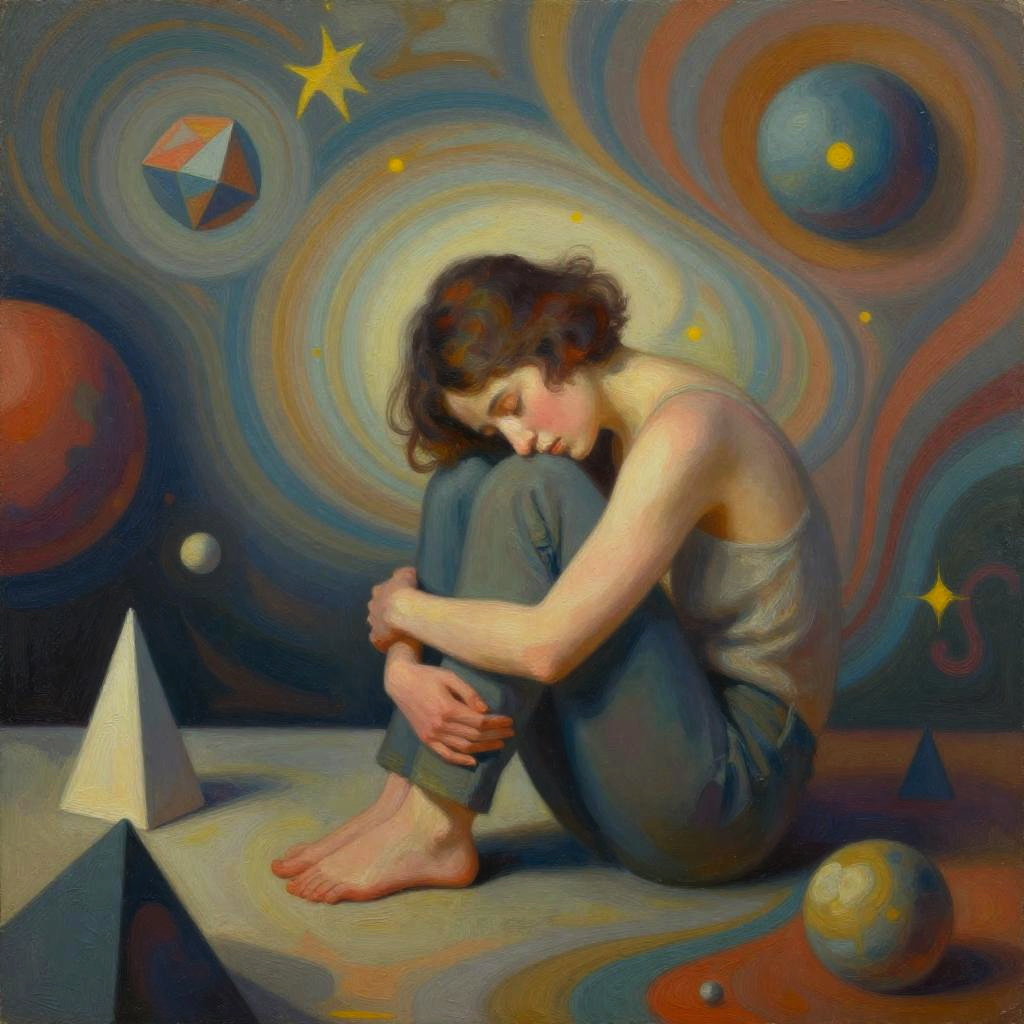 Person hugging knees in an abstract, surreal environment filled with swirling colors and floating geometric shapes, symbolizing inner peace and self-reflection, rendered in a dreamlike, painterly style with rich textures.