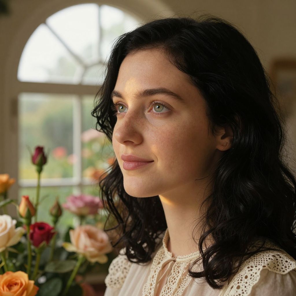 A photorealistic portrait of a young Caucasian woman exudes serenity and anticipation. Her compassionate green eyes shine beneath raven-black hair falling in soft waves to her shoulders. Illuminated by golden light streaming through an arched window, she transitions from contemplation to a subtle smile as if gazing into the unknown. Framed by a delicate lace collar, her flawless porcelain skin is adorned with natural freckles dotting her nose. Beyond the window lies a garden filled with vibrant blooms in various stages of bloom - tightly closed buds and fully opened roses symbolizing life's cyclical nature. This image evokes an emotional journey from tranquility to curiosity, capturing the essence of inner peace amidst impending mysteries.