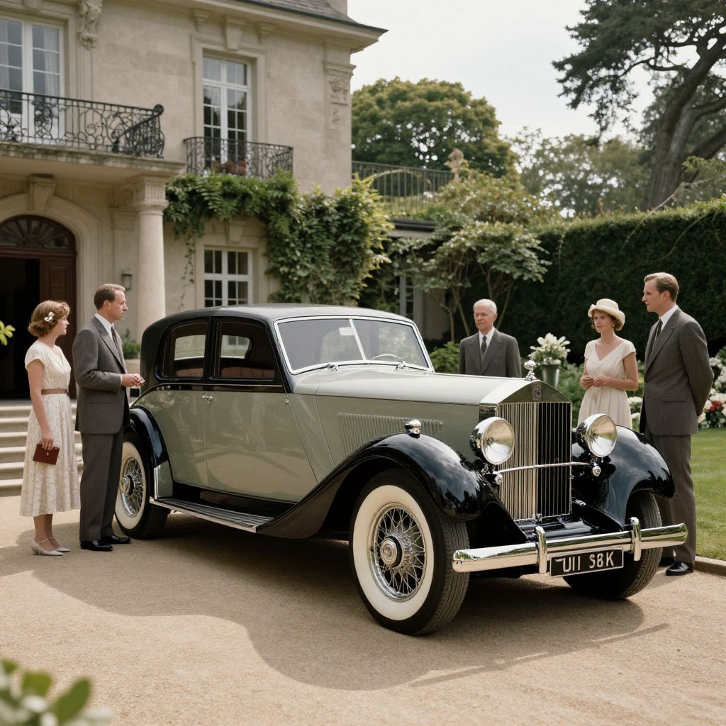 Old money 1920s vintage luxury lifestyle scene with a classic Rolls-Royce car parked outside a grand estate, wealthy figures in tailored suits and elegant gowns, lush gardens, detailed period architecture, soft sunlight casting long shadows