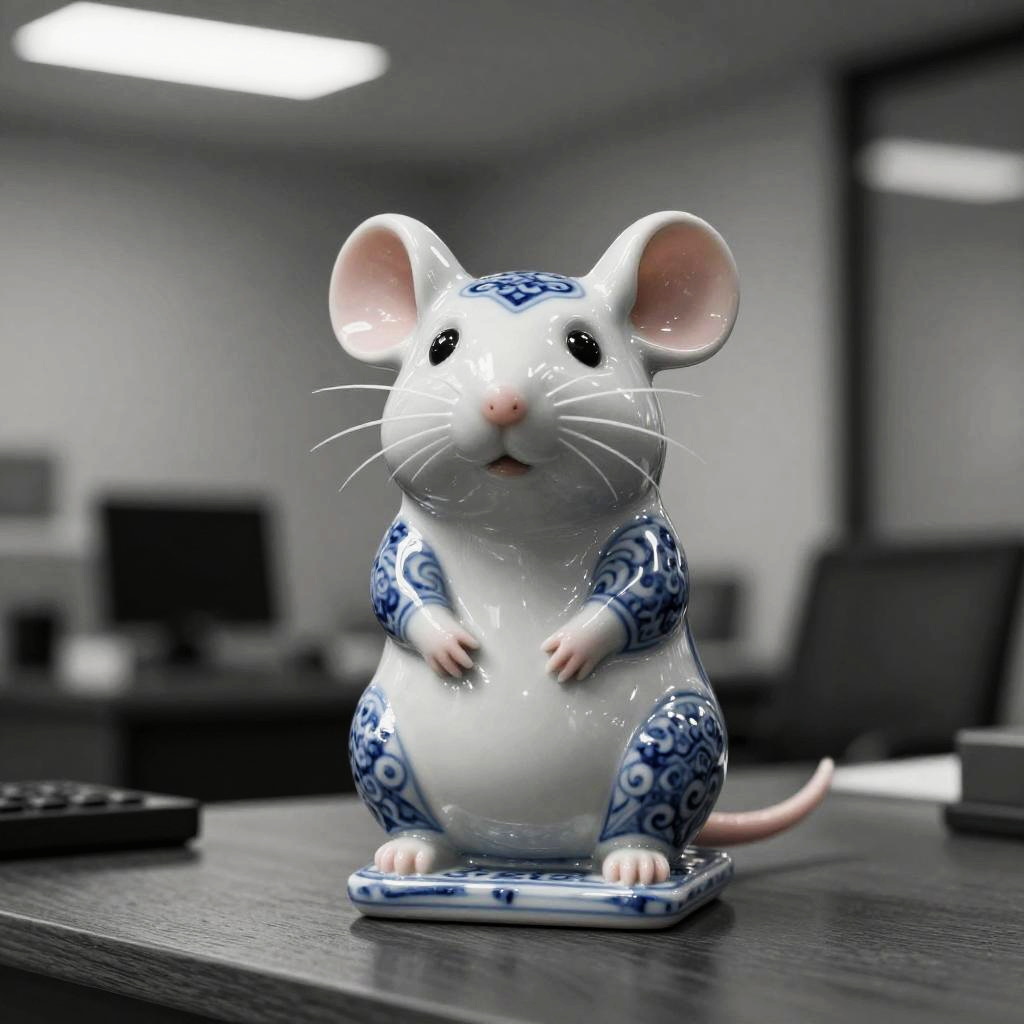 A statue of a rat standing on a table made of (bwporcelaincd_xl, blue and white porcelain, porcelain:1.2, shiny:1.3, solo:1.3) in office, indoors, full body, chinese zodiac, cutie, cute, still life, animal statue, front view, facing viewer, looking at viewer, (Unbelievable Digital Artwork:1.3), CGSociety, ArtStation, master works, 8K, HDR, UHD, masterpiece, best quality, highly detailed, emotional, harmonious, high budget, moody, epic, gorgeous, high resolution, perfect lighting, finely detail, extremely detailed, ultra detailed, realistic, photorealistic, huge filesize, photographic, real, wallpaper, moody lighting, volumetric lighting, reality ray tracing