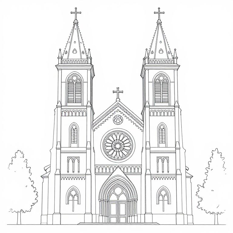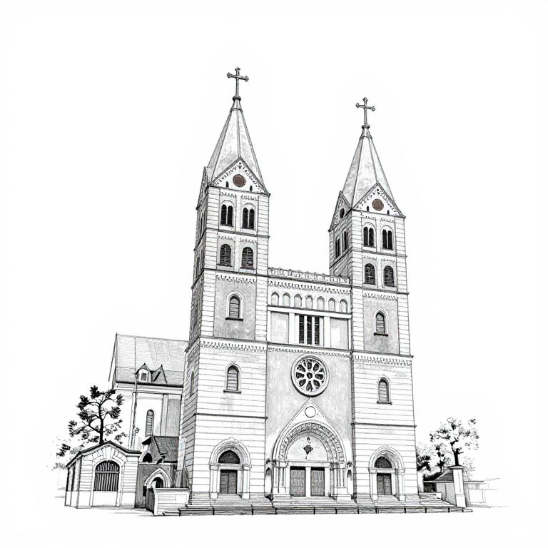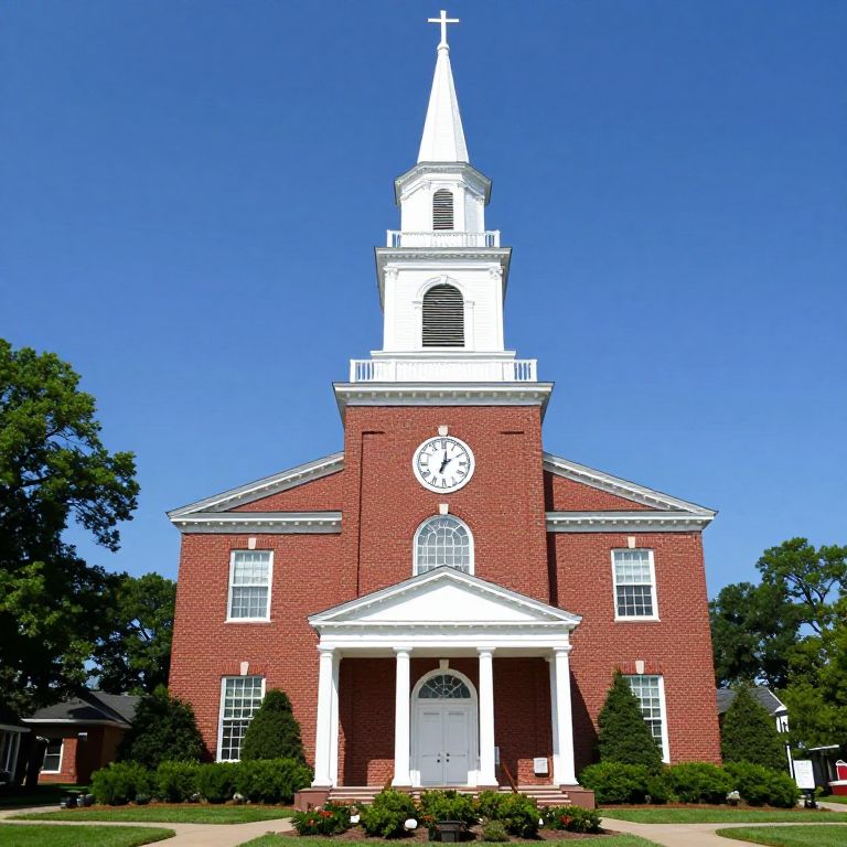 Aerial photograph of a red-brick church with a tall, white spire and arched windows, standing prominently in the center of a bustling urban area. Surrounding buildings include white and red structures with flat roofs, interspersed with green trees. The church's steeple rises sharply against a clear blue sky. The background reveals a sprawling cityscape extending to the horizon. The image is brightly lit, highlighting the textures of brick and metal roofs. The church is situated at an intersection, with a visible parking lot in the foreground.