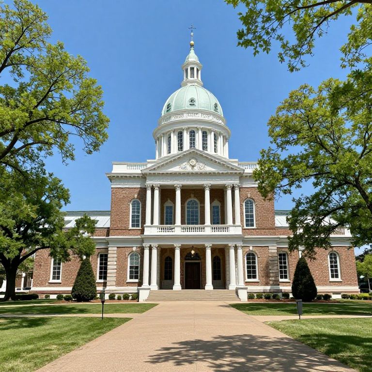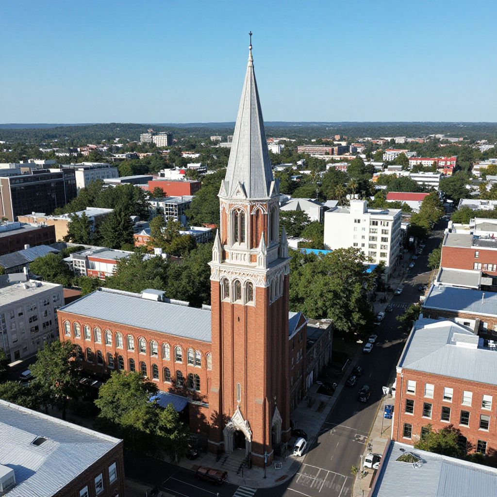 Aerial photograph of a tall, red-brick church with a white steeple, surrounded by trees and urban buildings, under a clear blue sky