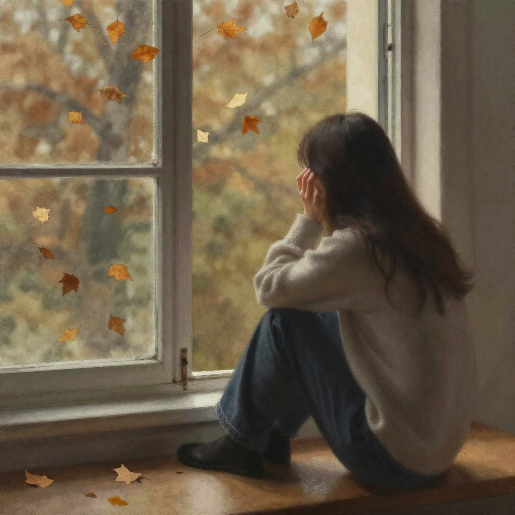 Melancholic solitude painting showing a person sitting by a window watching autumn leaves fall, warm but muted tones, watercolor style, quiet contemplative emotion