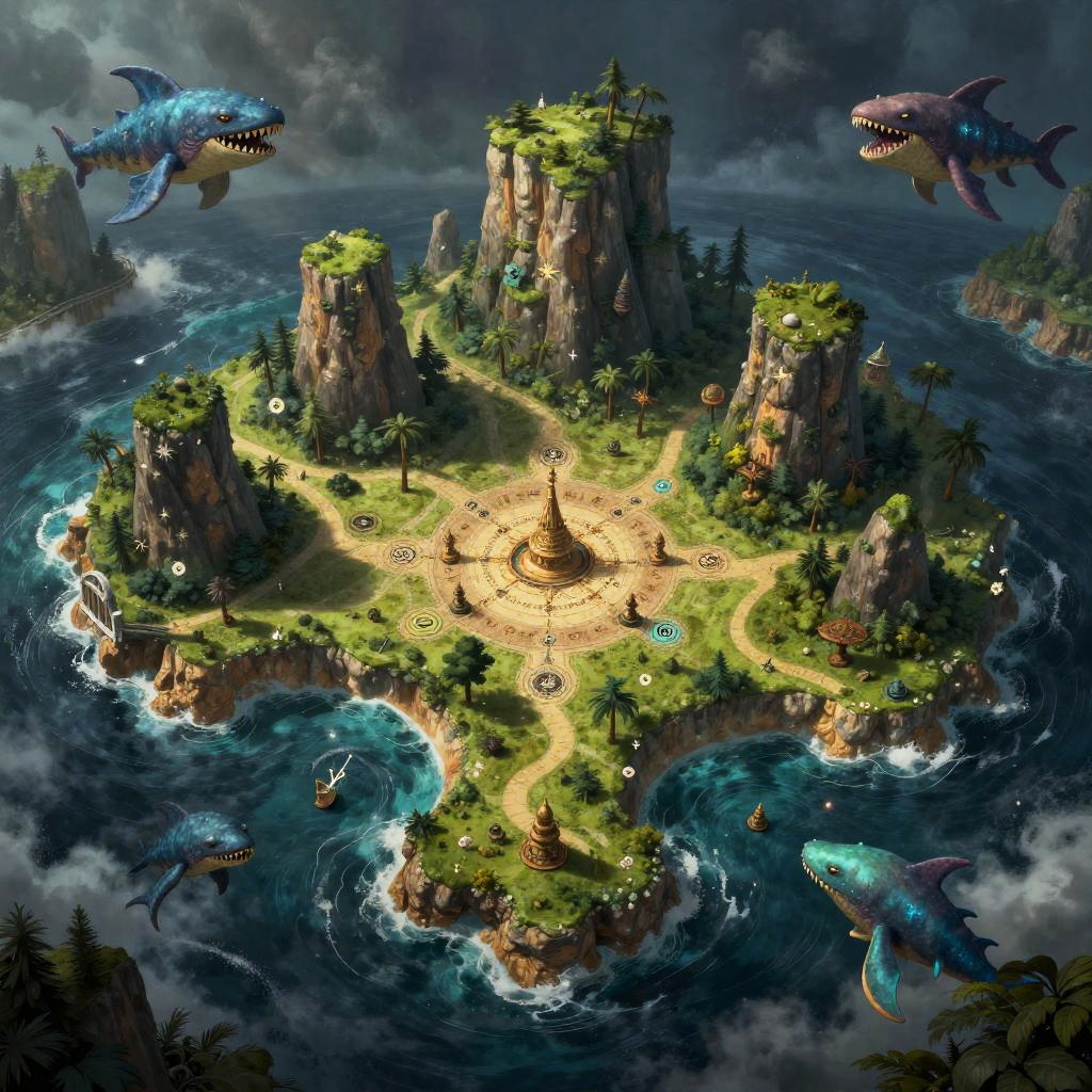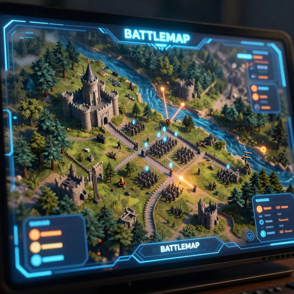 Battlemap generator visualization with multiple terrain types including deserts, swamps, and rocky hills, shown on a glowing touchscreen panel, surrounded by fantasy role-playing paraphernalia, mystical glyphs and magical effects illuminating the scene
