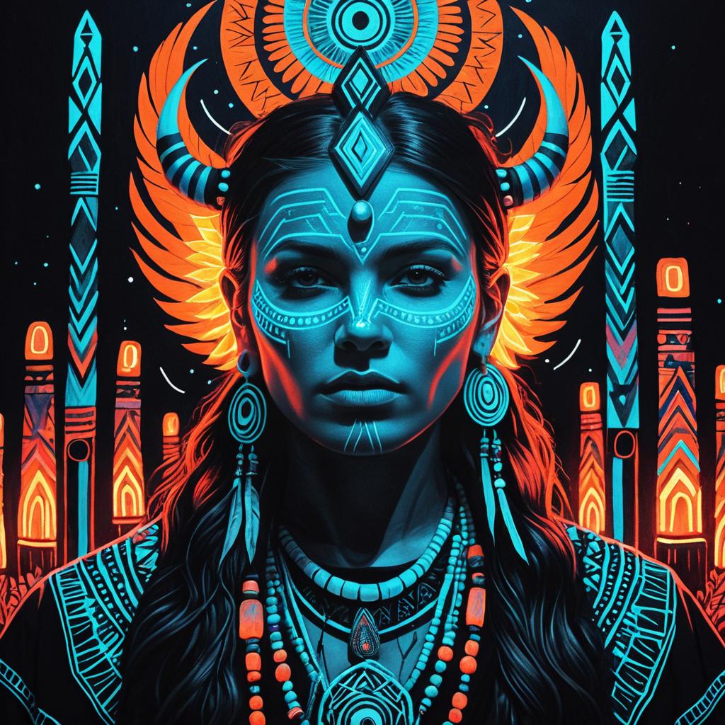 Illustration art, upper-body latina woman, with piercing amber eyes, simplified, consisting of turquoise, coral, and cream, limited to three colors, outline style, artistic stylish pattern.