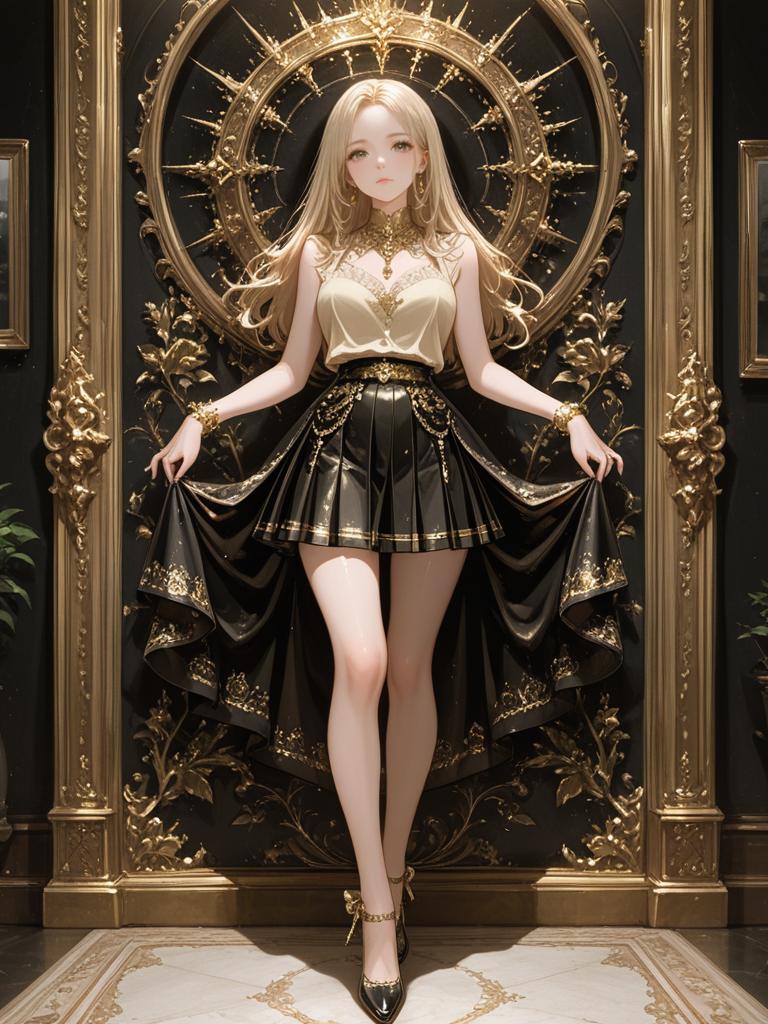 1girl, realistic face, full body shot, Woman, glam, sleeveless beige blouse with embellished neckline, gold sparkly pleated mini skirt, large statement ring.