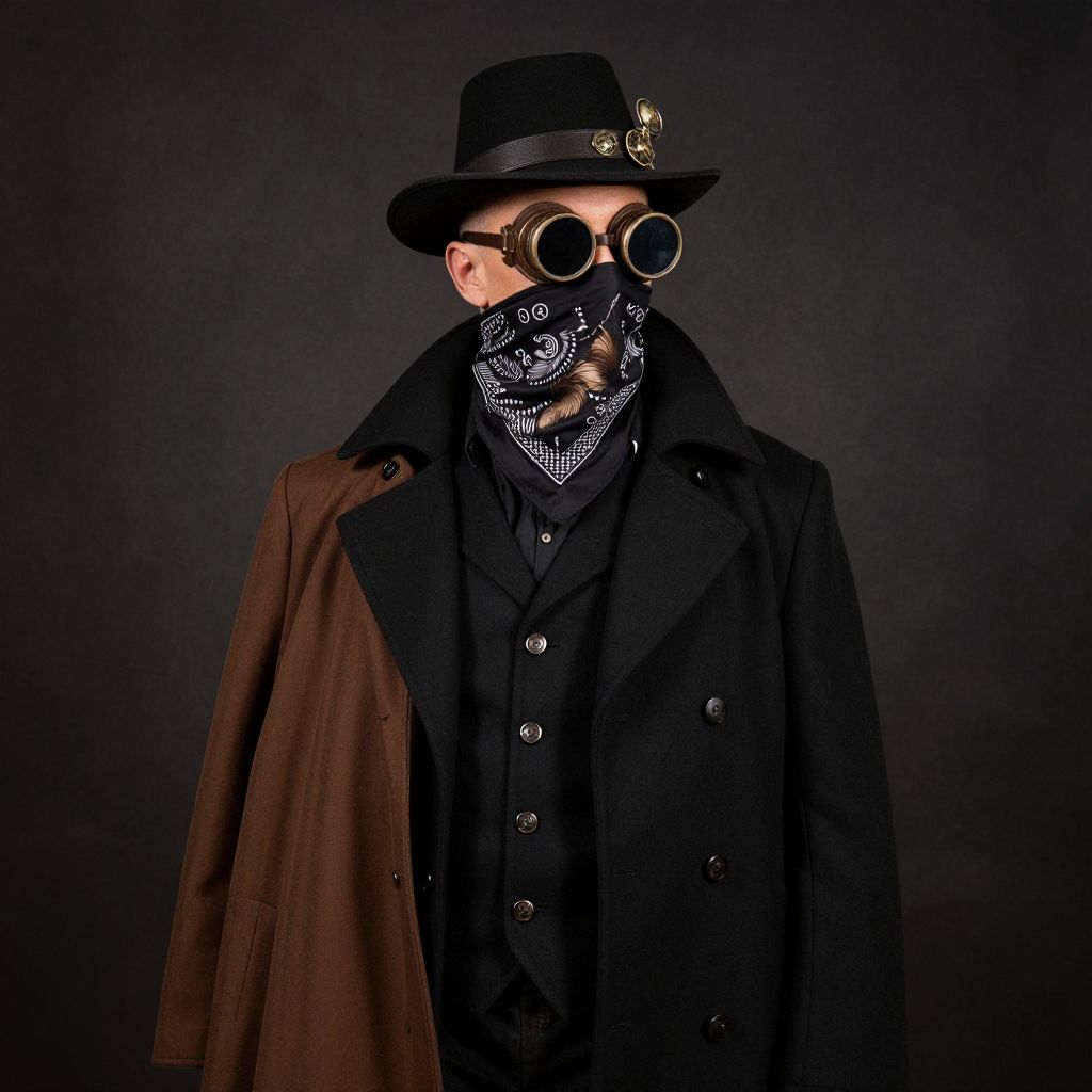 In this steampunk-inspired portrait, a man dons a 1870s black simple duster, with tan skin peeking through the intricate feather patterns on his black bandanna, which covers his nose and mouth. His eyes are concealed by a pair of steampunk goggles, adding a touch of vintage futurism to his appearance. The man's black preacher hat, adorned with metallic embellishments, sits atop his head, casting a shadow over his face. He is captured in a half-body pose, with his brown coat draped over his shoulders, revealing a black shirt underneath. The overall composition is professional, with the subject positioned against a dark, textured backdrop that contrasts sharply with his attire, emphasizing the details and craftsmanship of his costume.