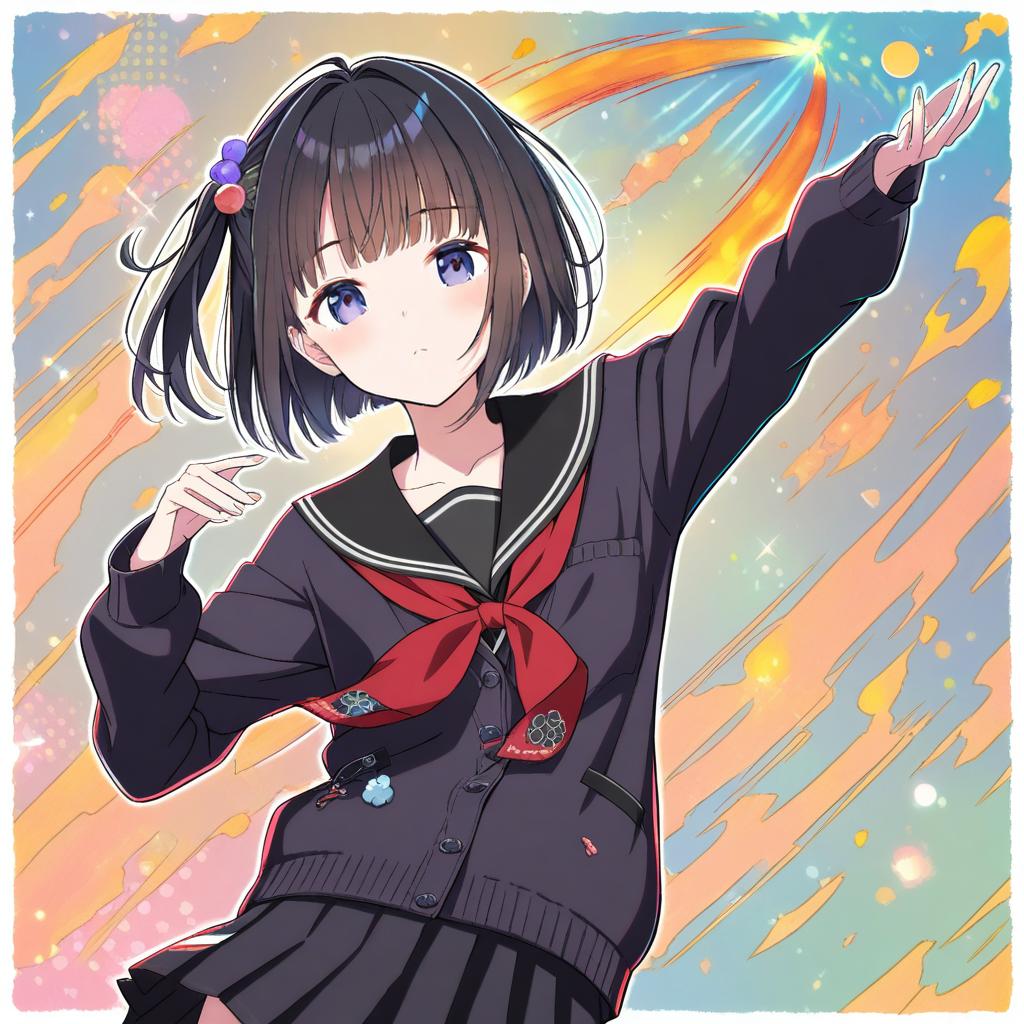 Amemori sayo, nijisanji, 1girl, black eyes, black hair, short hair, sidelocks, serafuku, pleated skirt, serafuku, black skirt, black sailor collar, long sleeves, virtual youtuber, virtual youtuber, one side up, red neckerchief, by artist speh, animagine