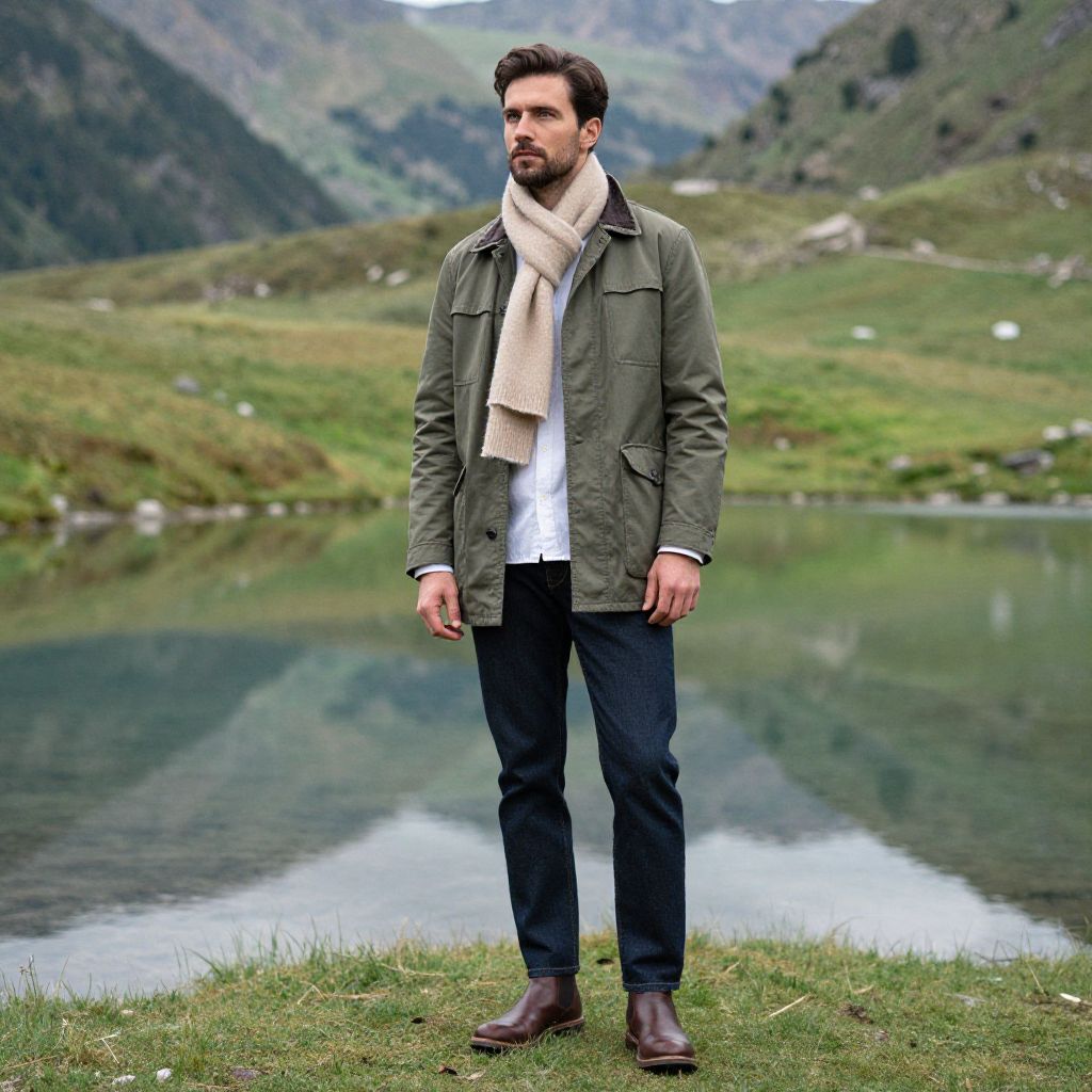 A man, classic beige trench coat, dark indigo slim-fit jeans, white cotton button-up shirt, brown leather Chelsea boots, standing on stone steps, historic brick building, cameraphone style, confident expression, warm sunlight illuminating the scene. Man has masculine face and piercing eyes