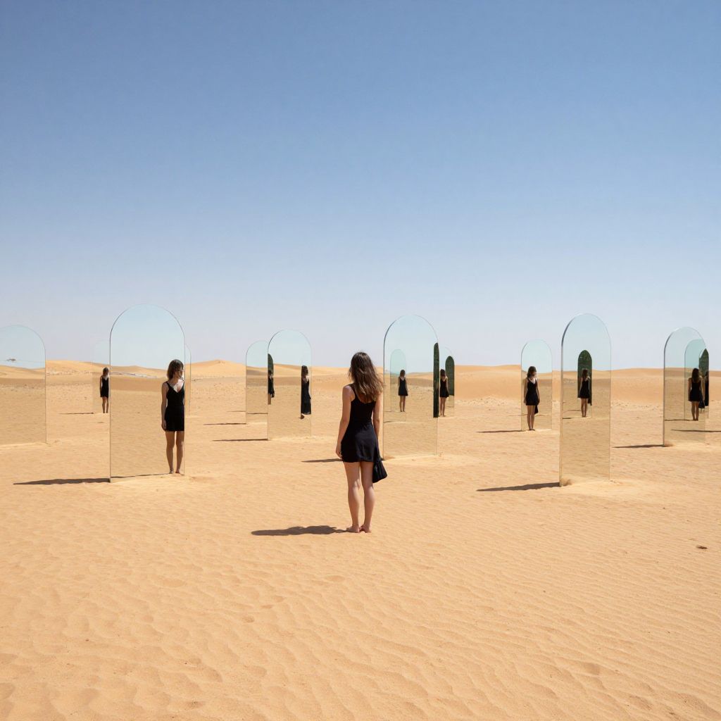 In a vast desert, a woman stands barefoot among an endless array of arching mirrors, each reflecting her silhouette against a horizon where reality blurs into infinite possibility.
