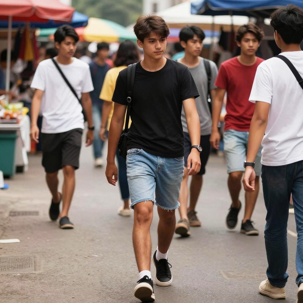 Tight shorts teen exploring a lively street market, diverse crowd, colorful stalls, candid moment, natural light, high detail, youth culture