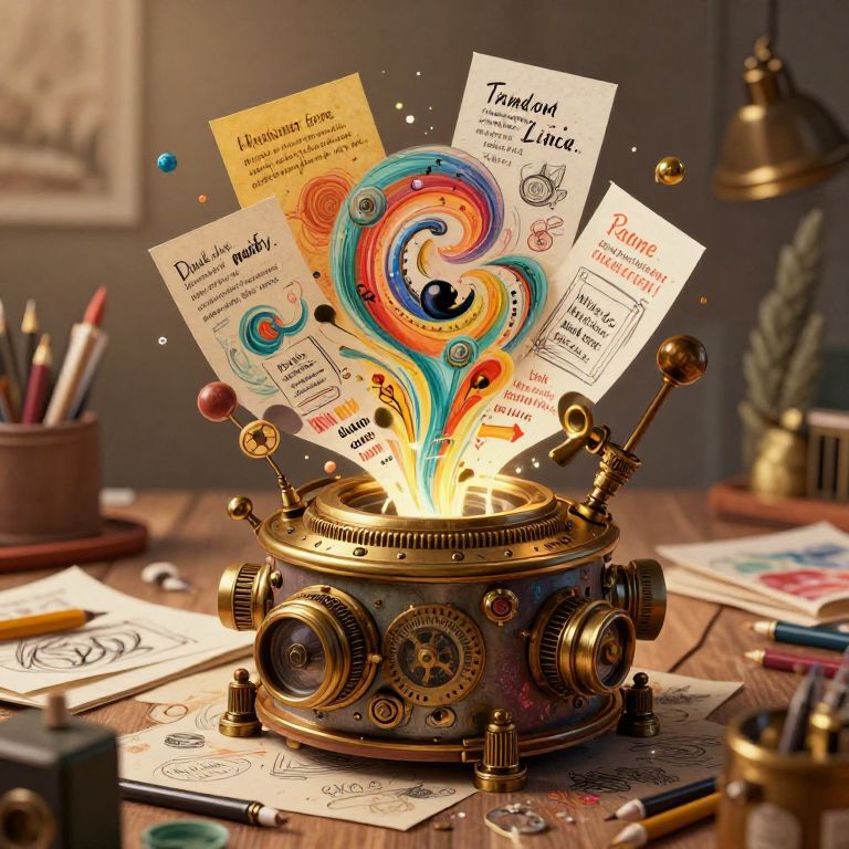 Random action generator for drawing, depicted as a whimsical steampunk device producing diverse art prompts and swirling animations, surrounded by scattered art supplies and sketchbooks, lively and imaginative atmosphere with rich textures and warm tones