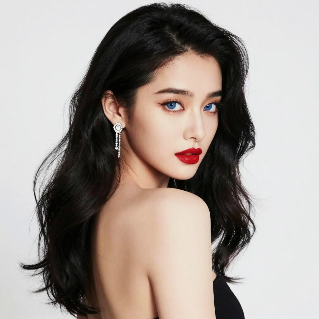Photograph of a beautiful woman with pale skin and striking blue eyes, looking over her shoulder. She has long, wavy black hair pulled back and is wearing bold red lipstick. Her left ear is adorned with a sparkling, dangling earring. She's dressed in a strapless black top, showcasing her bare shoulders. The white background makes her features pop. The overall vibe is glamorous and classic.
