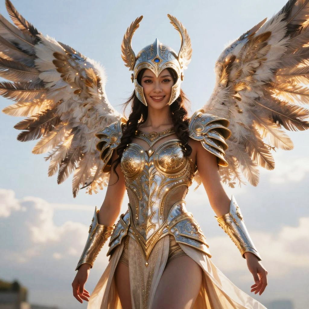 Valkyrie with Glowing Feathers in Sky